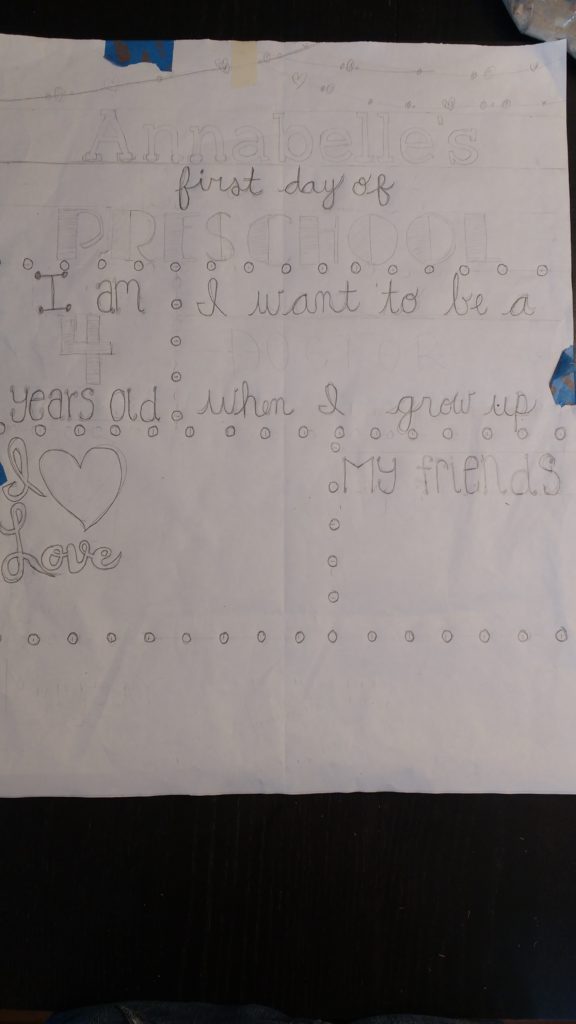 While the paint is drying, cut a piece of paper the size of the chalkboard so you can design how you want your picture to look. The darker words are the ones I knew I would be painting on the chalkboard. If you would like PDF files of the permanent words, you can find them here and here