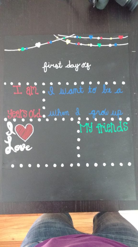 This chalkboard is one that can be reused year after year, with different children. The main sections are painted on (using paint pens) while the sections that change are done with plain old chalk.