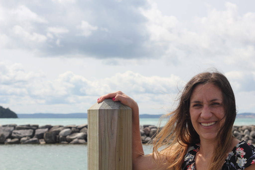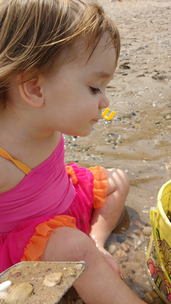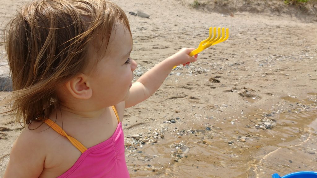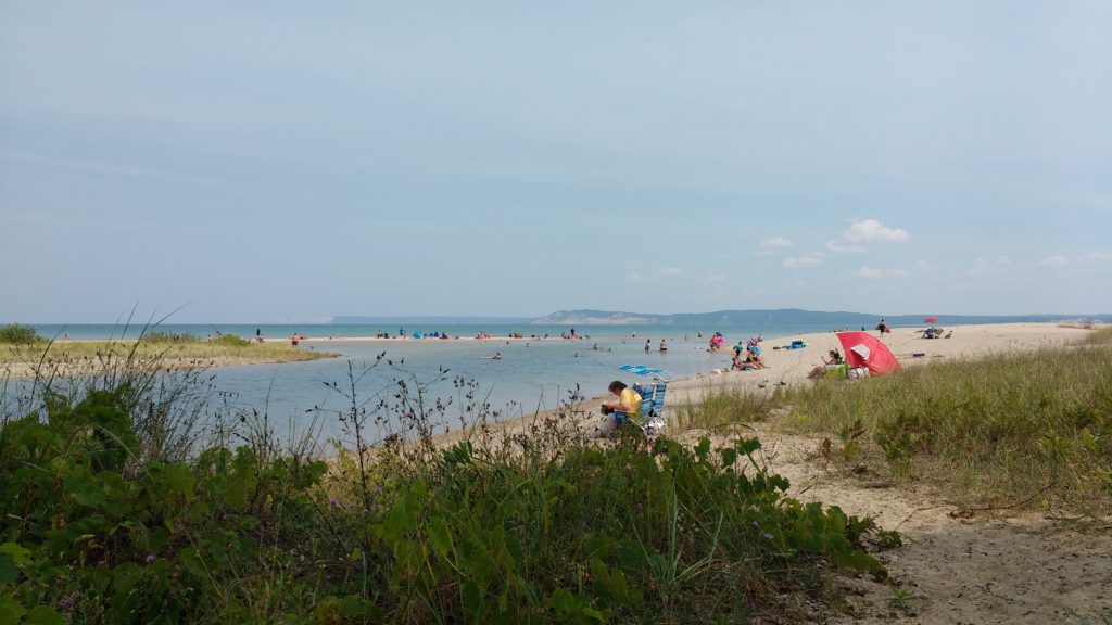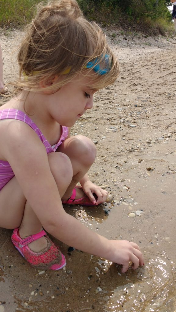 On Sunday we headed to a beach on Lake Michigan. What’s super cool about this beach is that it has a river that runs into the lake. The river is shallow, and a great place for the kids to play. Do you see the sandbar in the picture below? The river is closest to you you, then over the sand bar is Lake Michigan. In the distance you can see Sleeping Bear Dunes. We took the kids to the lake for a bit, but spent most of our time at the river.