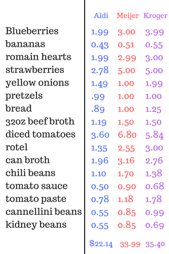 This month I decided to do something different, and did the bulk of my shopping at the same time. I got all my canned goods from Aldi, then went to Kroger and Meijer (the stores I frequent the most) to see how much I would spend on the same canned goods (I calculated the price based on the store brand).