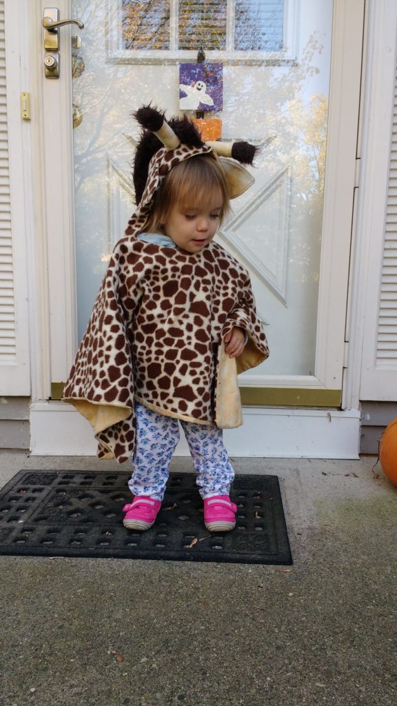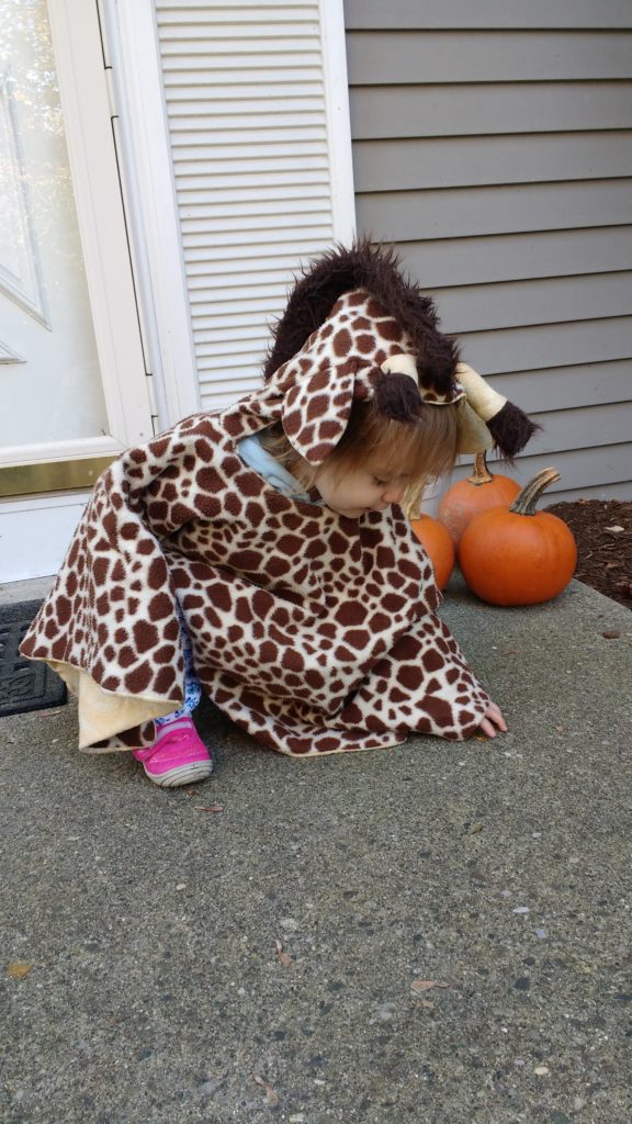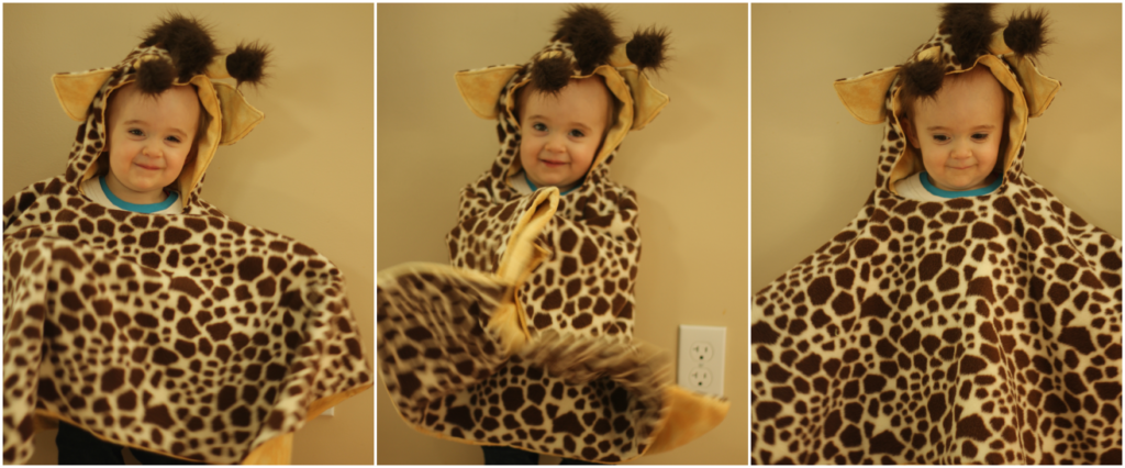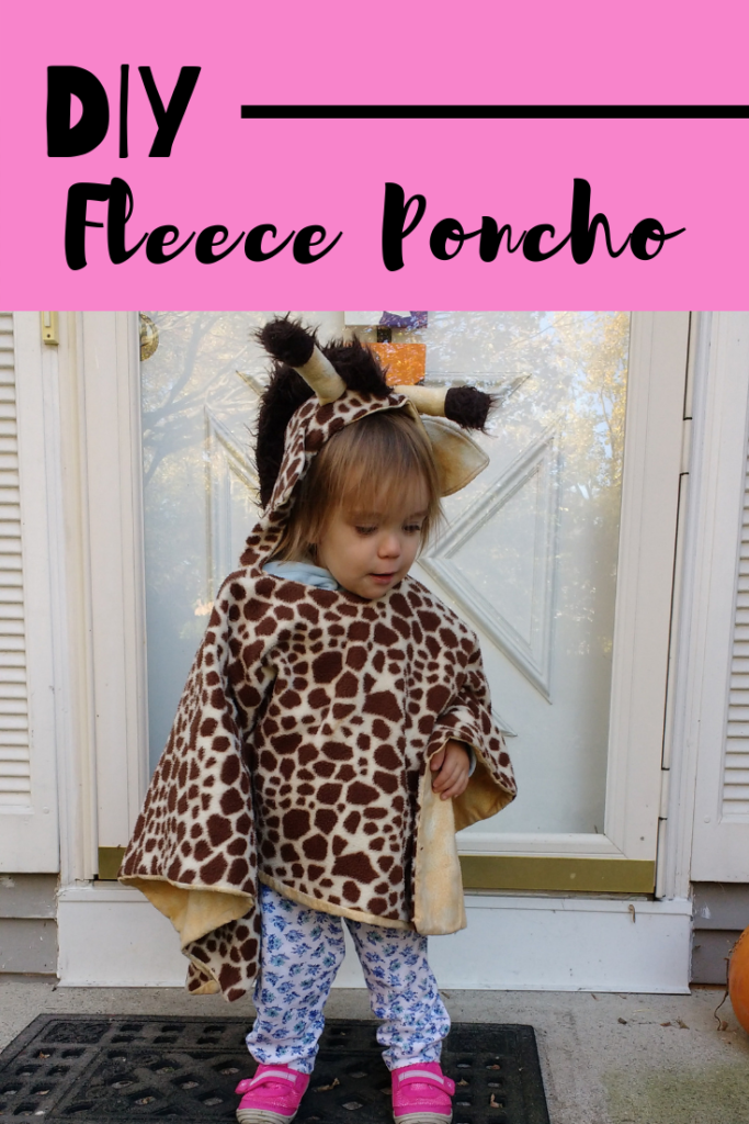 I am so happy that the cold weather is finally here to stay. I love being able to have a fire and cozy up under some blankets. What isn’t so fun is dealing with getting the girls in and out of the car. We all know that coats and car seats don’t mix, so you have to find solutions to keep kids warm. That’s why I made a fleece giraffe poncho for Annabelle back when she was two.