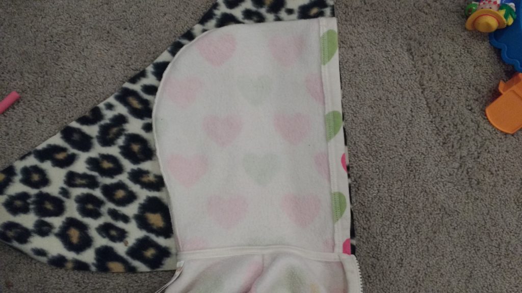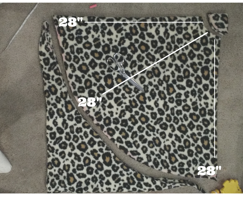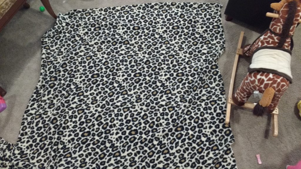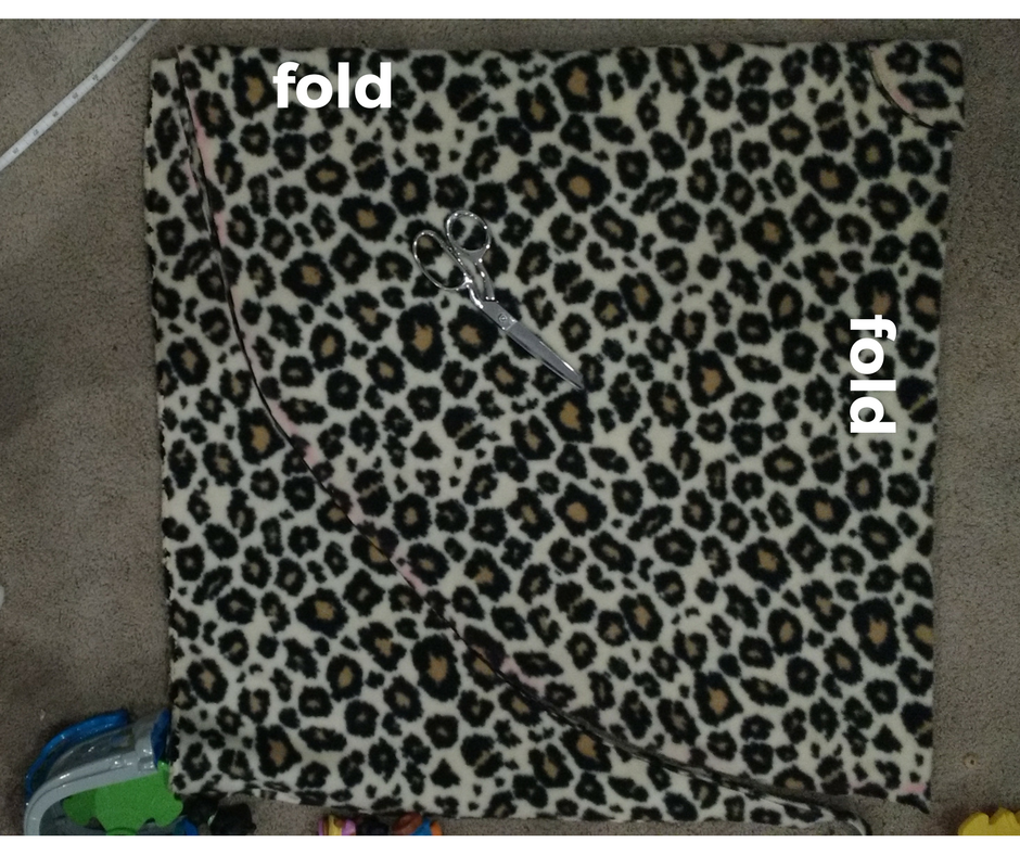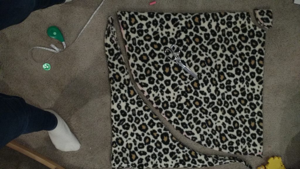The first thing you need to to is cut your fabric. I started with but cutting the fleece fabric. To determine how big you cut the square you will need to measure your child finger tip to finger tip. You will want to cut your squares at least a few inches bigger than that. I made mine extra big so that it’s good for a few years.