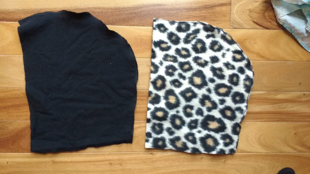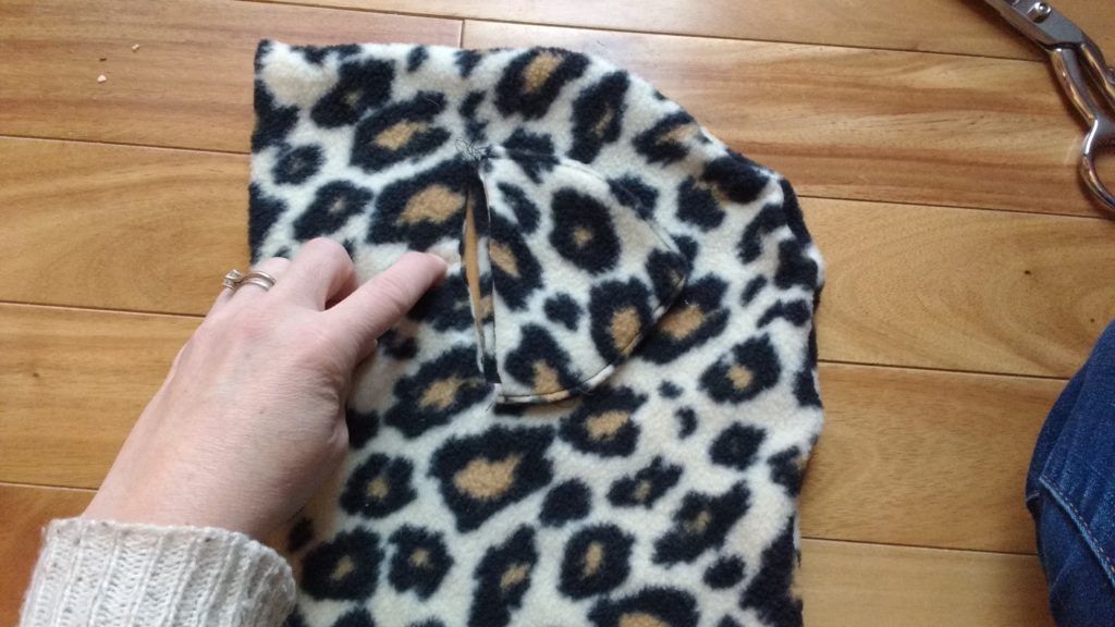 Next you need to cut ears out of fleece. I used two pieces per ear to give it some stability. After you have sewen the ears together you need to make a slit on each side of the hood.
