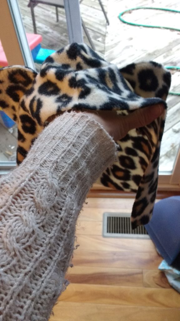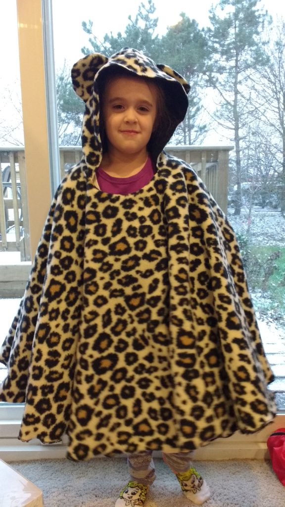 I finally got my act together and made Annabelle her own poncho, this time going with a cheetah. I took pictures so that you can do the same! It’s actually not to hard to do, and they turn out super cute!