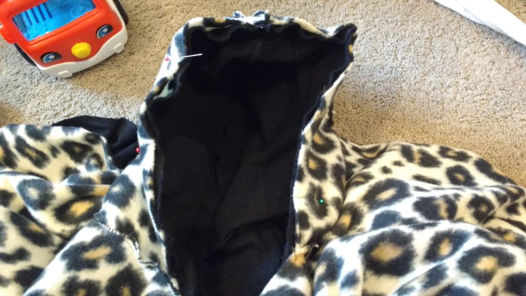 With the fleece poncho there really isn’t a “right” way. Just start pinning the hood to the poncho, with right sides together.