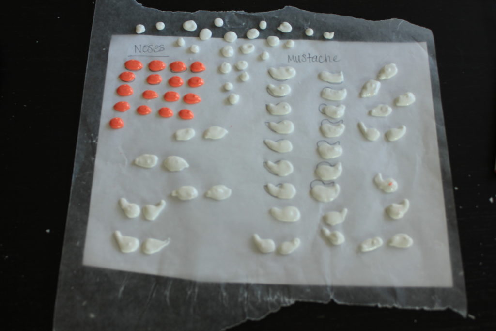 While your Santa is drying make a nose, beard, and puff ball for the hat on wax paper. I drew the shapes first on a piece of paper then put the wax paper over it and traced them
