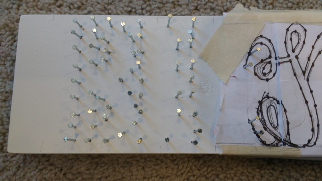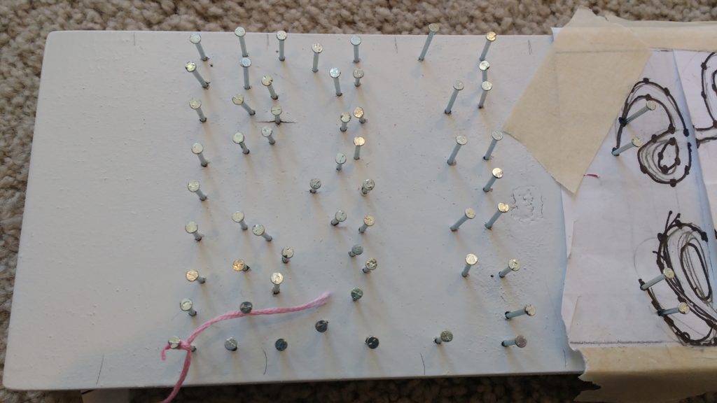 Next up print up page one and page two  of this super professional (read it’s hand drawn) template, tape it to the piece of wood, and start hammering in the nails.