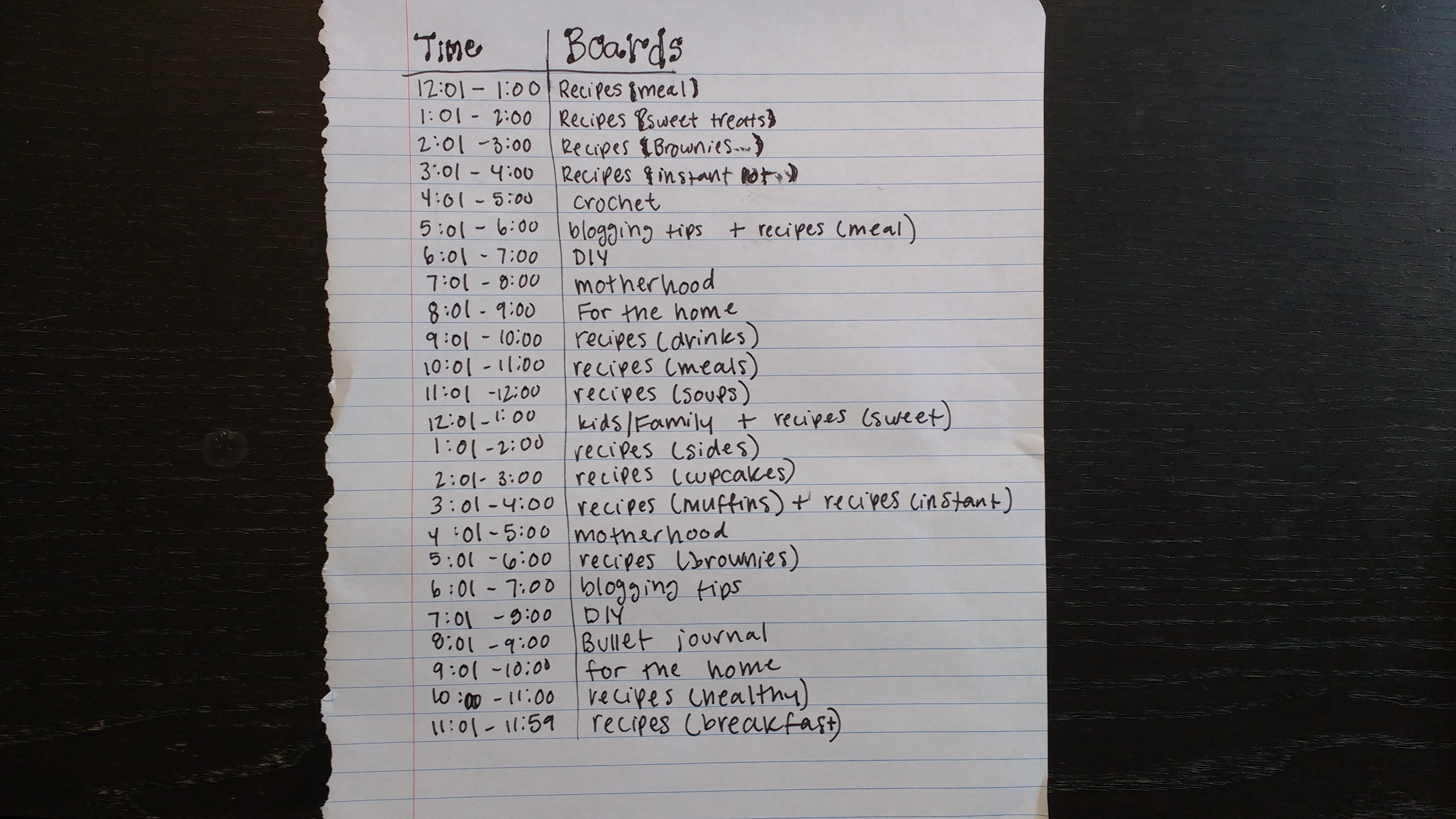 Off I made a quick 24 hour table, and then wrote down which boards I wanted pins to be published from. You’ll notice that some boards are written twice, and that some times I have two pins being scheduled.