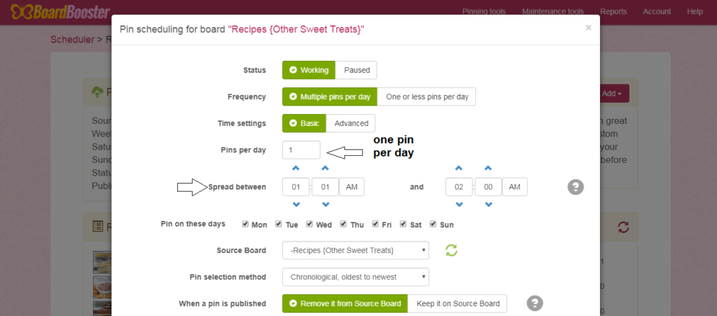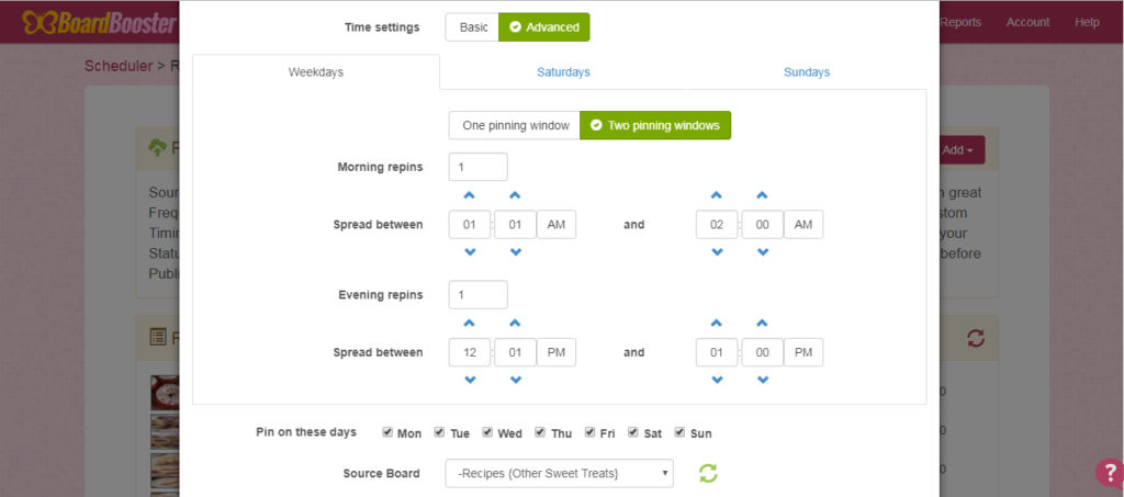 If you want to pin from your secret board at two separate times, simply hit advanced, then two pinning window. This will give you the option of morning and evening repins. It does take a little bit of time to change each tab (weekdays, Saturdays, Sundays), but when it’s done, you should be able to load up your secret boards, so you know that you are pinning something at least once an hour each week. My scheduler is actually configured to publish 33 pins a day, since I wanted a few more pins each day.