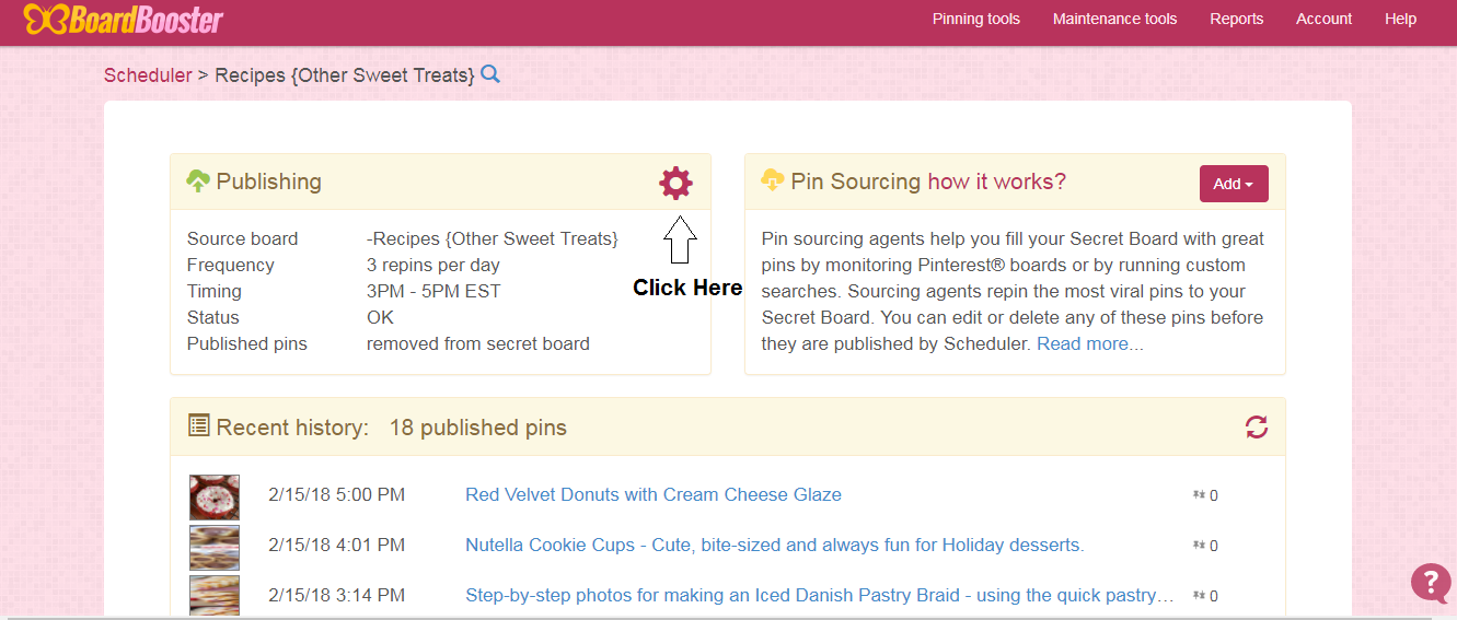 Since I knew the times, I logged into BoardBooster and started customizing each of my secret boards by clicking the gear next to “Publishing”.