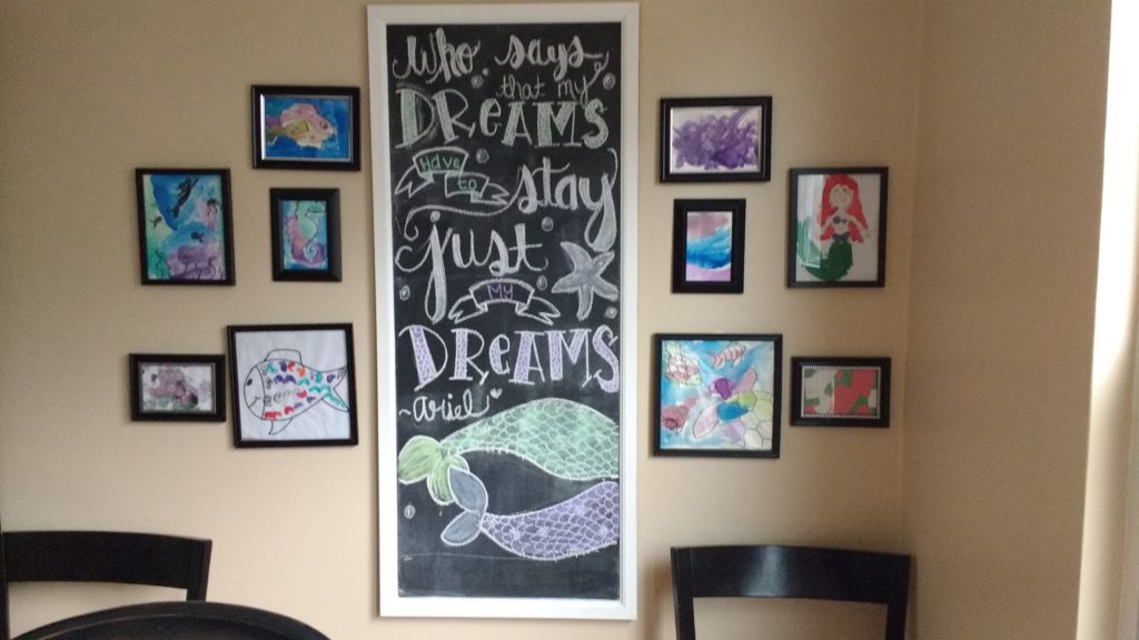I worked on the chalkboard for Annabelle’s birthday party which is coming up this weekend. As always I did a rough sketch on a piece of paper before doing it on the chalk board. Not trying to brag, but I am very impressed with who it turned out.
