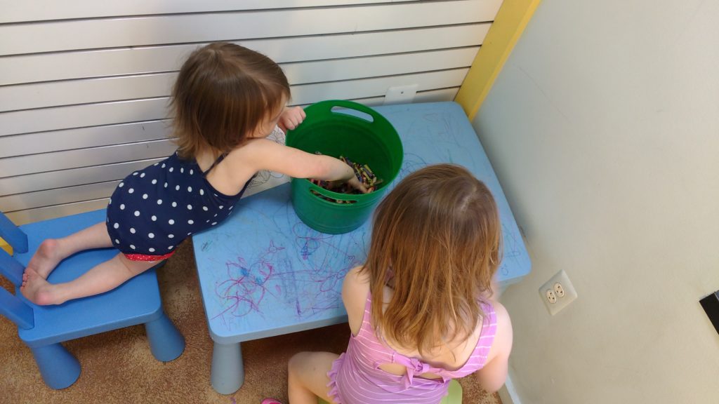 Sometimes we get to swim classes early, and have some down time. Goldfish has paper and crayons to help occupy little ones. This is also great for if you have one child in class, and another child waiting.