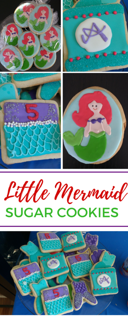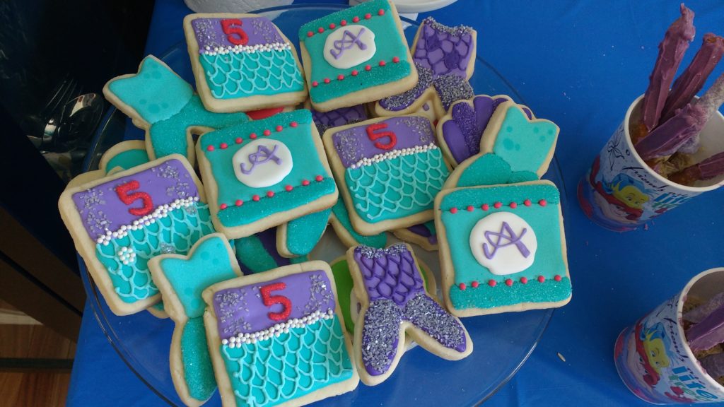 Next up the sweets. If you’ve followed my blog for a while, then you know that I love decorating sugar cookies. A few years ago I discovered royal icing and have been hooked ever since. I made cookies for people to snack on during the party, and also an Ariel cookie to put in the goodie bags.