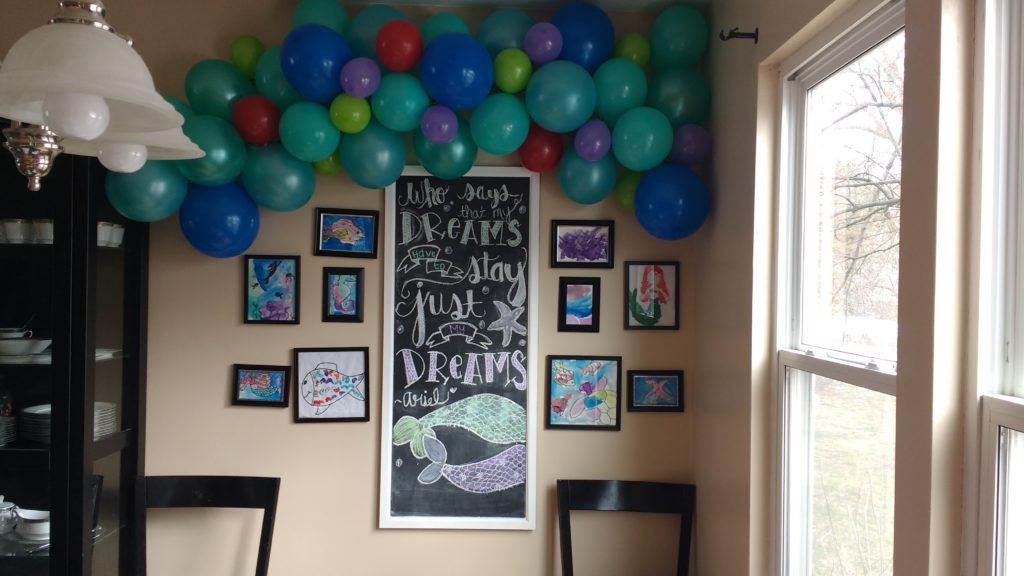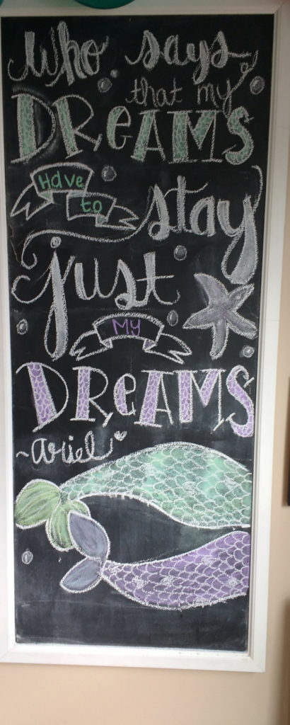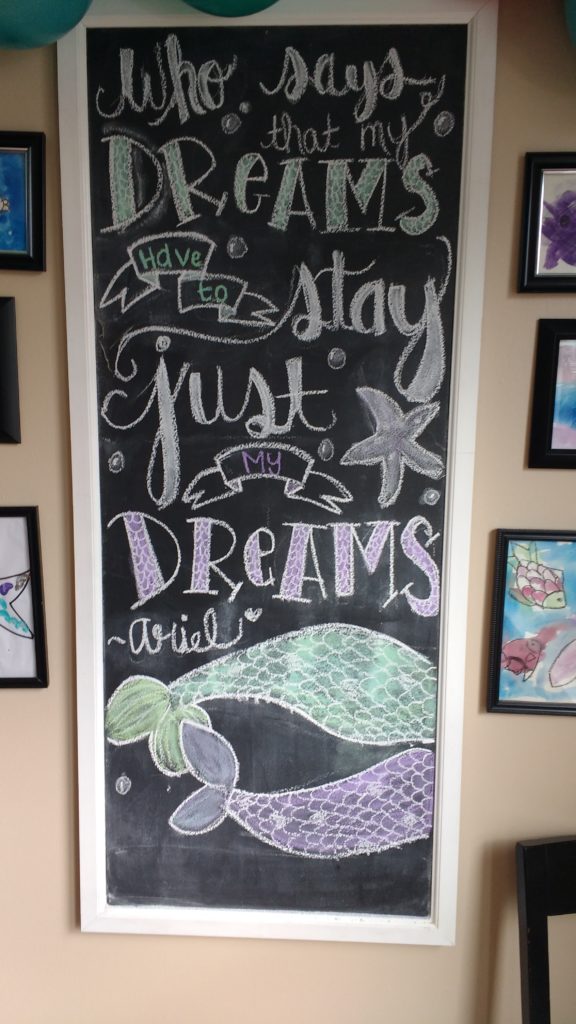 To start off with I knew I needed something awesome on the chalkboard. I always use the chalkboard wall as my focal point, so I wanted something cool and mermaid related. I looked up some Little Mermaid quotes and “who says that my dreams have to stay just my dreams” came up a lot. Now don’t ask me where in the movie Ariel says that, ’cause I couldn’t tell you, but I really like the quote. I sketched it out on paper, then put on the chalkboard. I am pretty impressed with how it turned out, so I’m going to continue bragging a bit about it. I also think it will be up for quite some time.