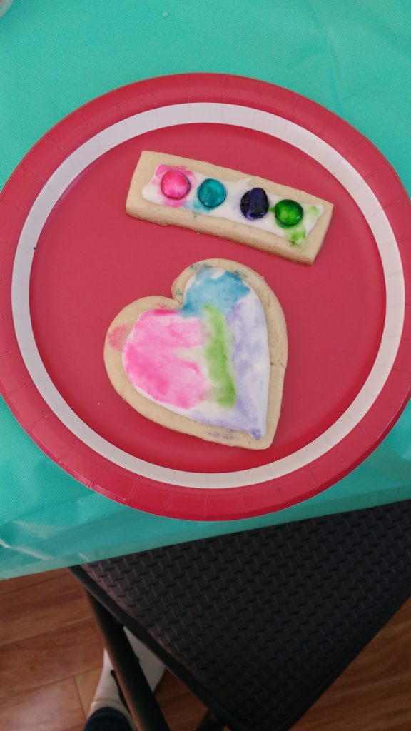 The paint your own cookie went over really well! While there are super fancy ones online, I went with simple since the kids were five. To make these I simply flooded a sugar cookie with white royal icing and let it dry. To make the paint palette made royal icing dots, let them dry, then painted them with a few coats of gel food coloring mixed with some water. After they dried I used royal icing to attach them to to the rectangular cookie.