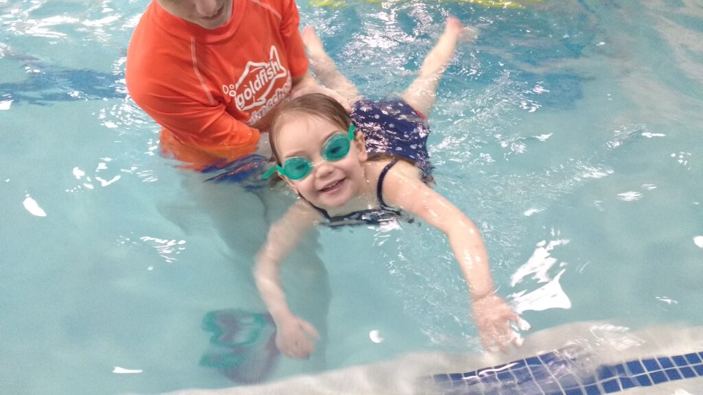 I know that all the teachers at Goldfish have gone through extensive training. They know how to work with kids. There are also lifeguards on duty, who watch from the deck of the pool. I know that Autumn is safe, and I really feel 100% comfortable with the new level she is in.