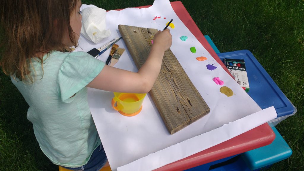 While we were working on the pergola, Annabelle wanted to paint her own wood board. She really loves being crafty, and I love letting her be (even though I didn’t want to part with any of my precious weathered wood 😉 ).