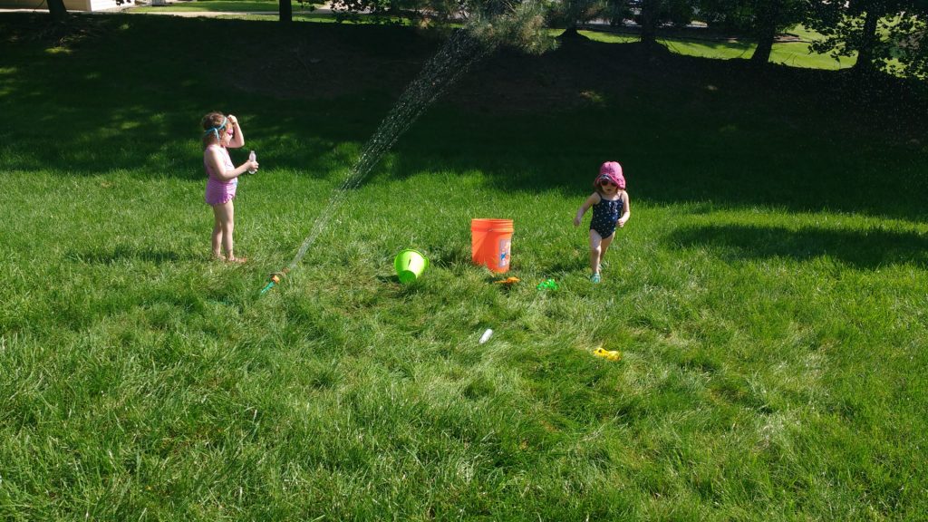 Since it was crazy hot this weekend (and why wouldn’t it be? We had so much to do outside) the girls had a blast running in the “water sprinkler”. It was nice since it kept them somewhat entertained while we did outside work (we also weeded our raspberries and got our square foot garden all planted).