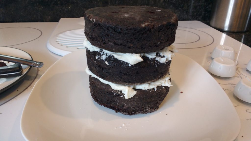 Using buttercream frosting and begin to assemble your cake.  Yes it’s going to be tall.