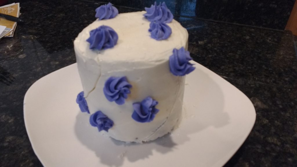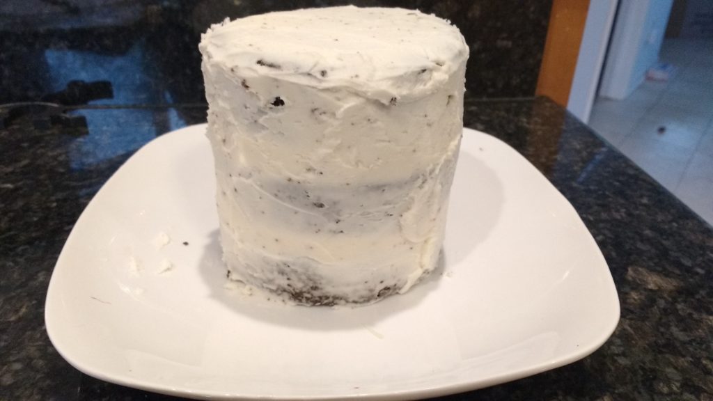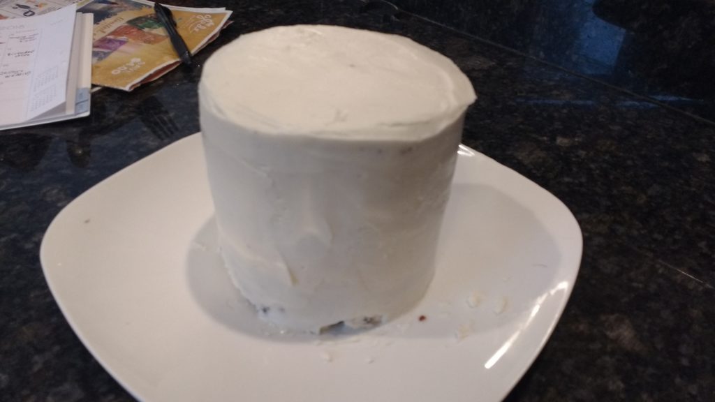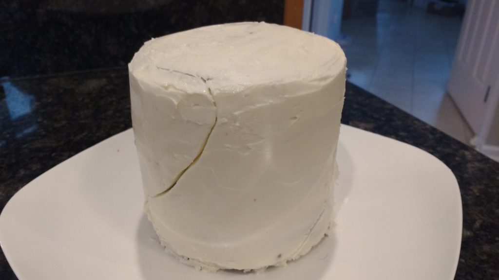 Once the cake is put together, you’ll want to put a light layer of frosting on the edges, known as a crumb coat. After putting the crumb coat on, you will put the cake in the fridge for about an hour or so to harden up. This helps keep the crumbs from showing up on your top layer. You can see it’s just a light layer, and not very smooth.