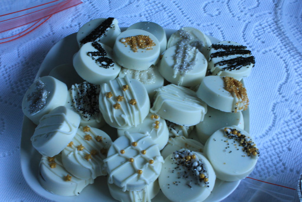 We had sugar cookies. I made stencils using my Silhouette and then used Wilton Color Mist. My favorite ones are the cirlces with stirpes and dots and the number 70. Also, don’t tell my husband, but I think I want to get an airbrush now…