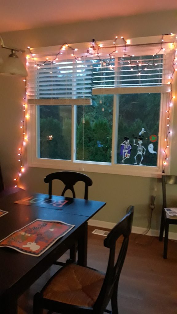 I also added a bit more Halloween decorations up. I bought these lights at the end of last year at a major discount and I’m loving how they look around the window.