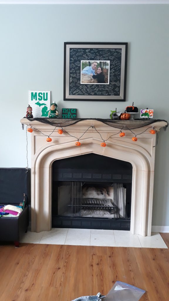 Nothing too fancy for my mantel. Since it is still football season I had to keep up some of the MSU stuff (even if they aren’t doing all that great). I got the black netting from the dollar store, and it works great! I wanted to pick up a few more, but by the time I went back, the Christmas stuff was already going up!