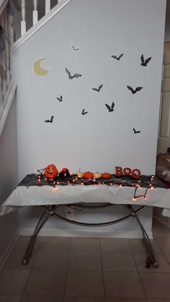 I threw a white plastic table cloth on the table in the front hall. I then used a spiderweb table runner I bought on major sale last year. I topped that with lights (once again a end of the season sale), real pumpkins, and a few other pieces of Halloween decor that I have collected over the years. The new addition were the bats and moon. I think it adds just the right amount of spooky. 😉