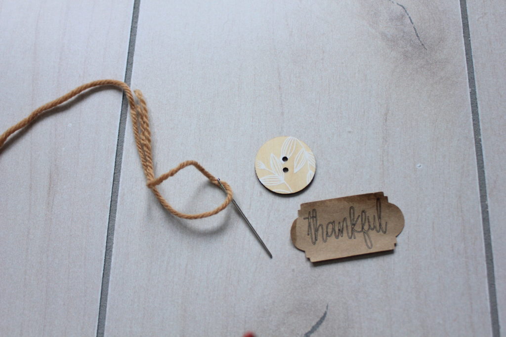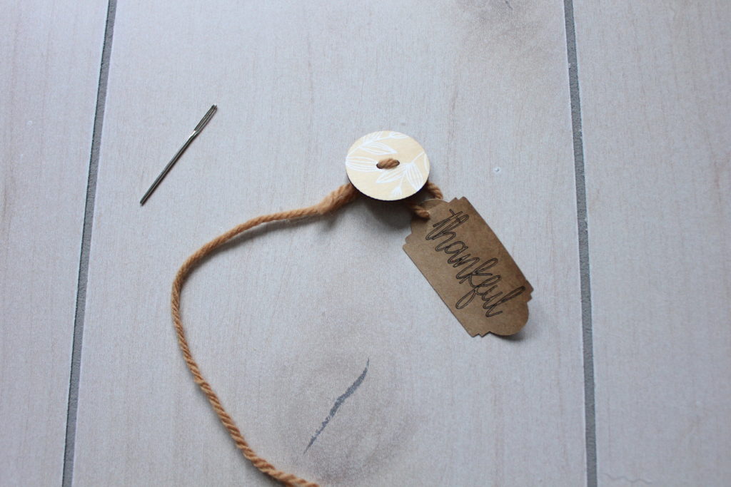 Use yarn and button to thread thankful tag on
