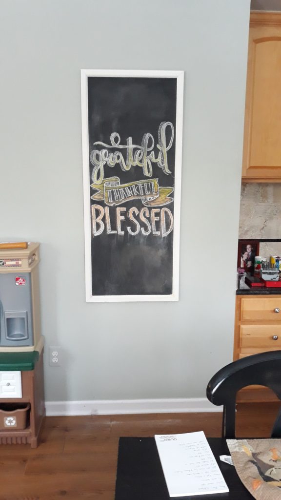 I really like how this chalkboard turned out, and I will probably be a little sad when I change it. I’m also sad to say that the chalkboard is breaking. 🙁 I’ve had it for close to seven years (I started using it to document my weeks when I was pregnant with Annabelle). Matt noticed too and commented he’d have to make me a new one. I’m thinking it needs a bit more of a decorative frame, and maybe a few inches wider. Thoughts?