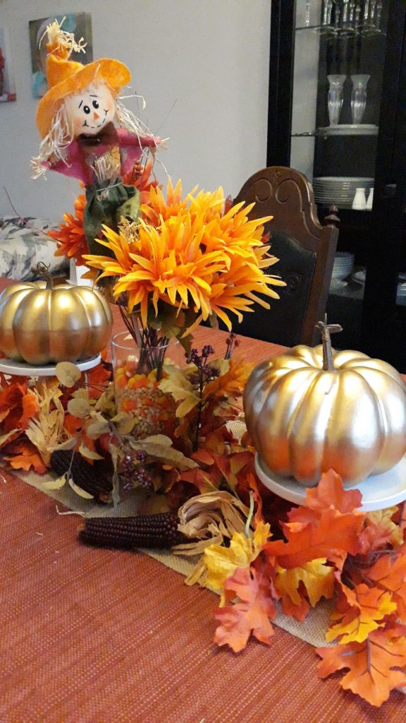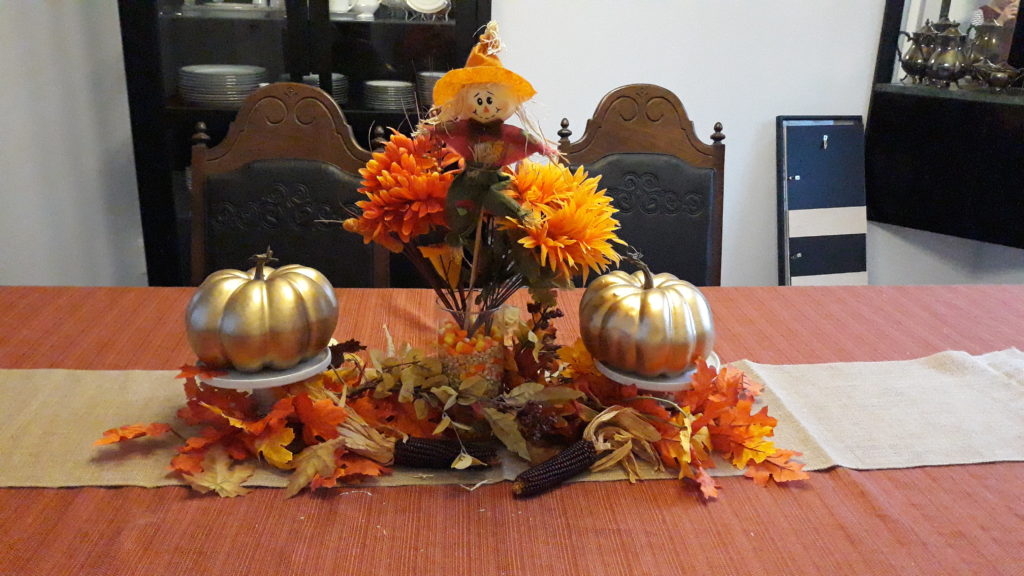 Last year we did not have a dinning room table to decorate. My MIL moved, and gave us her dinning room table since it wouldn’t work in her new condo. This is the first time I have actually been able to decorate it! If I didn’t have kids or a jerk cat that jumps up on the table when he things we aren’t watching, I would have already had the china and napkin rings set up.