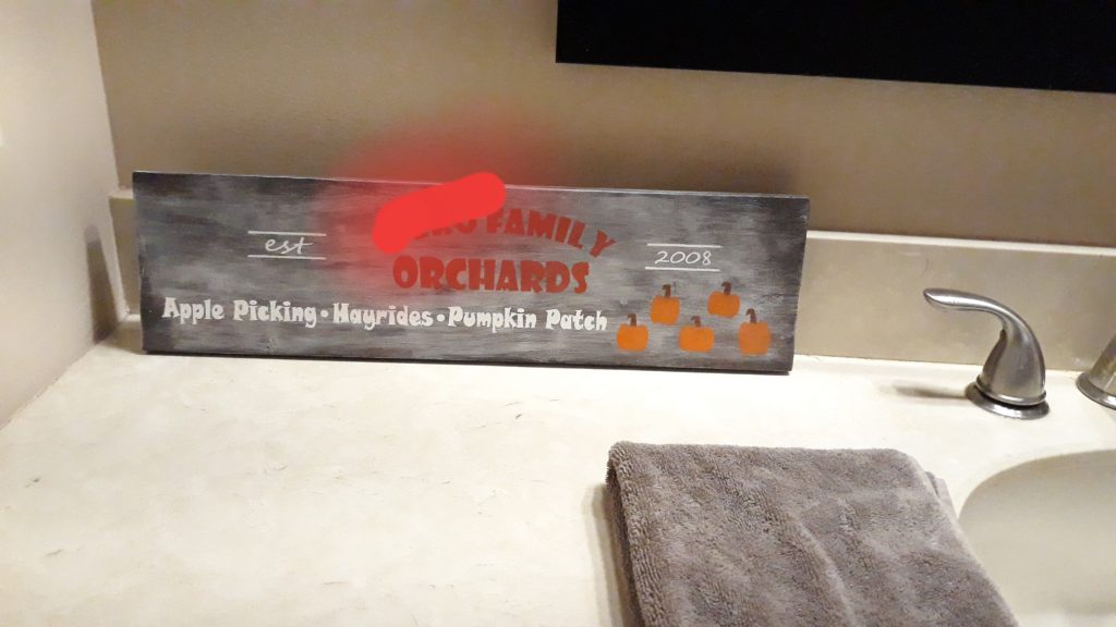 So, not a whole lot, but I did put this sign in the bathroom. Next year I hope to buy more leave garland to put up. Maybe some signs to hang on the wall. But I really do love how the sign turned out. You can check out this post to see how I did it. And if you have a silhouette you can even get the cut file. Yes, I blurred out the name. While I know it would probably be easy to find my last name, I try not to post it.