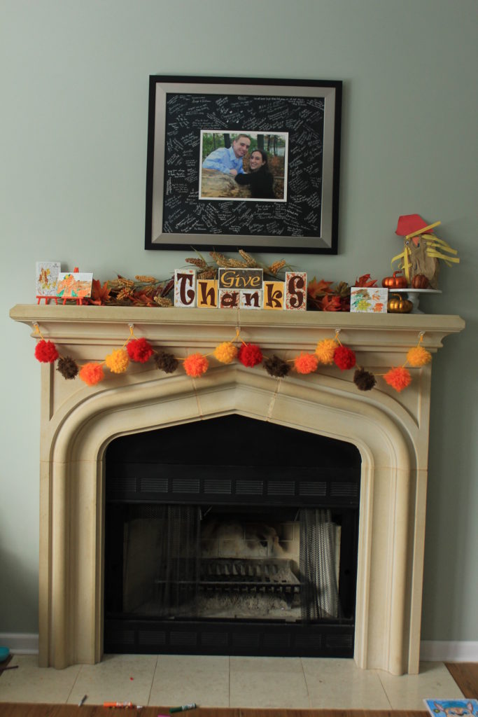 I made the Give Thanks blocks, and the pom pom garland. Annabelle made the scarecrow in preschool, and both girls painted the little canvases.