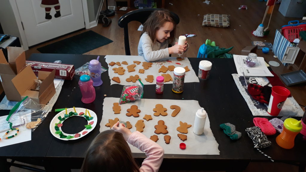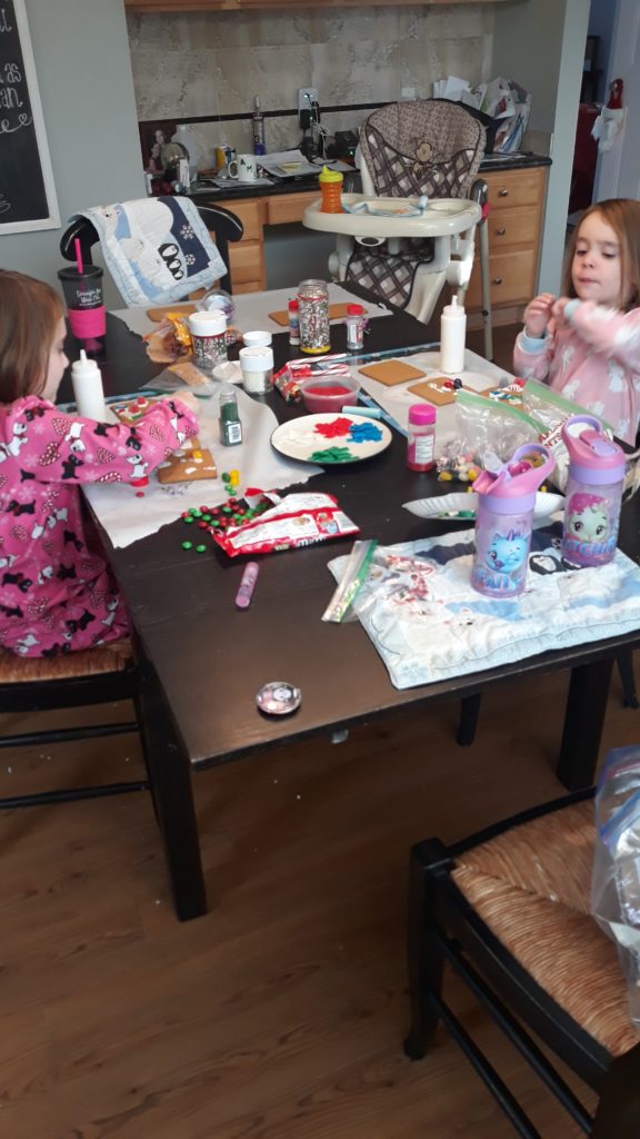 The girls also started decorating their gingerbread houses. I’ve started having them decorate the pieces first. Letting them dry, then assembling it. Much, much, much easier.