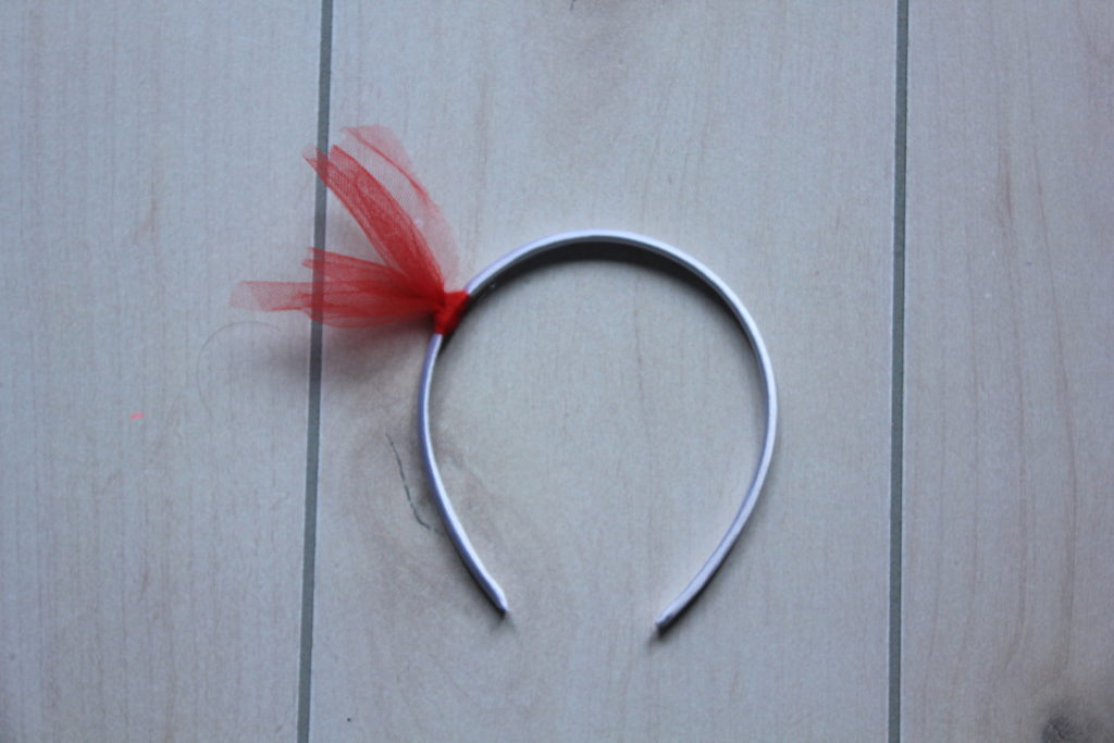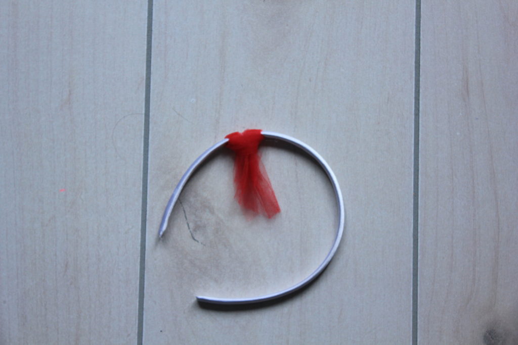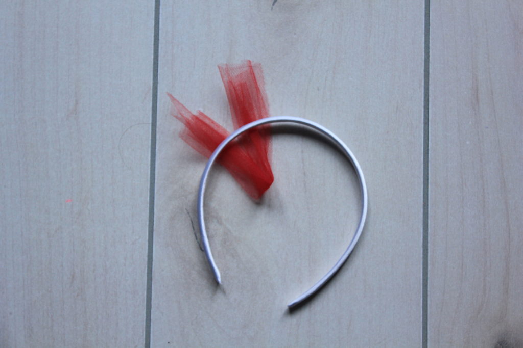 To attach the tulle start by folding it in half and placing it under the headband.