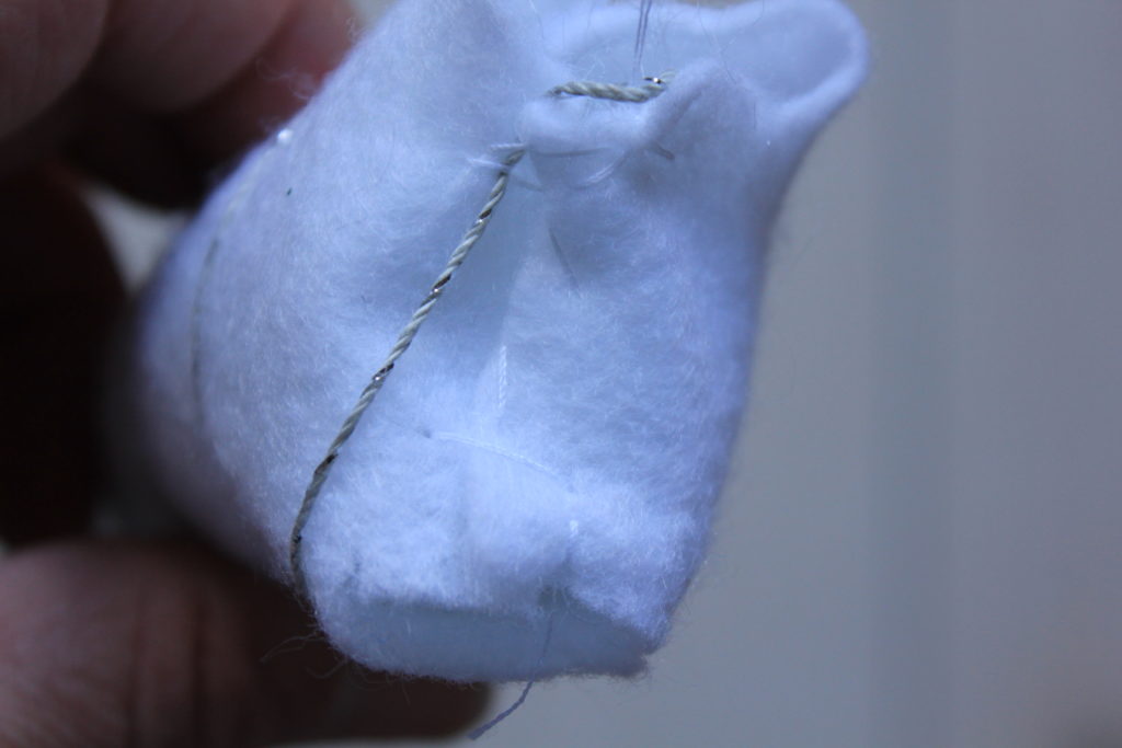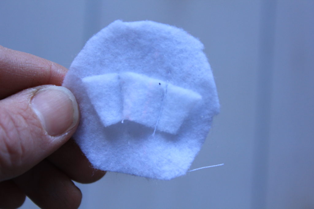 Sew the small tab at the bottom of the circle. This is what you are going to put the headband through. Then sew this circle onto the bottom of the horn.