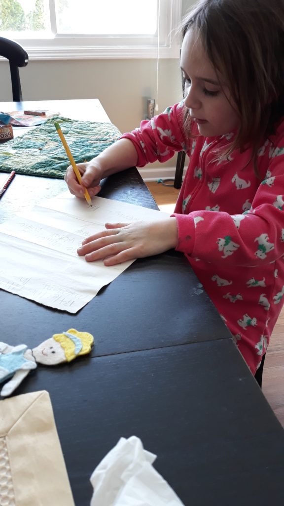 We’ve been working on some of the writing assignments her teacher has given. Annabelle is also writing a book. We are talking about beginning, middle, end; character development; and problem and solution.