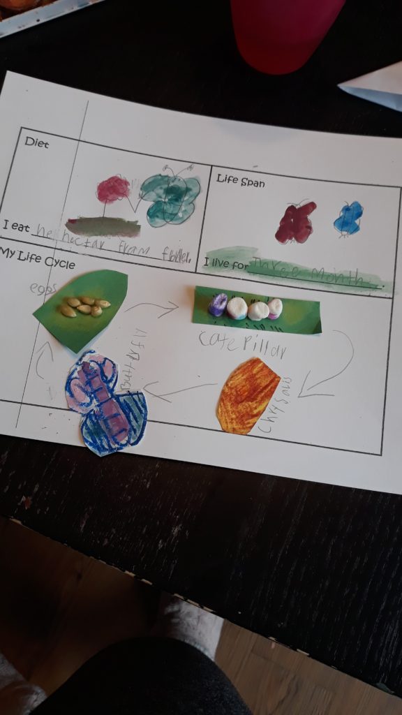 Most of our science has been working on an insect report for Annabelle. She is doing one on butterflies. I ordered some books from Amazon (you know since the library was closed), and watched a few videos.