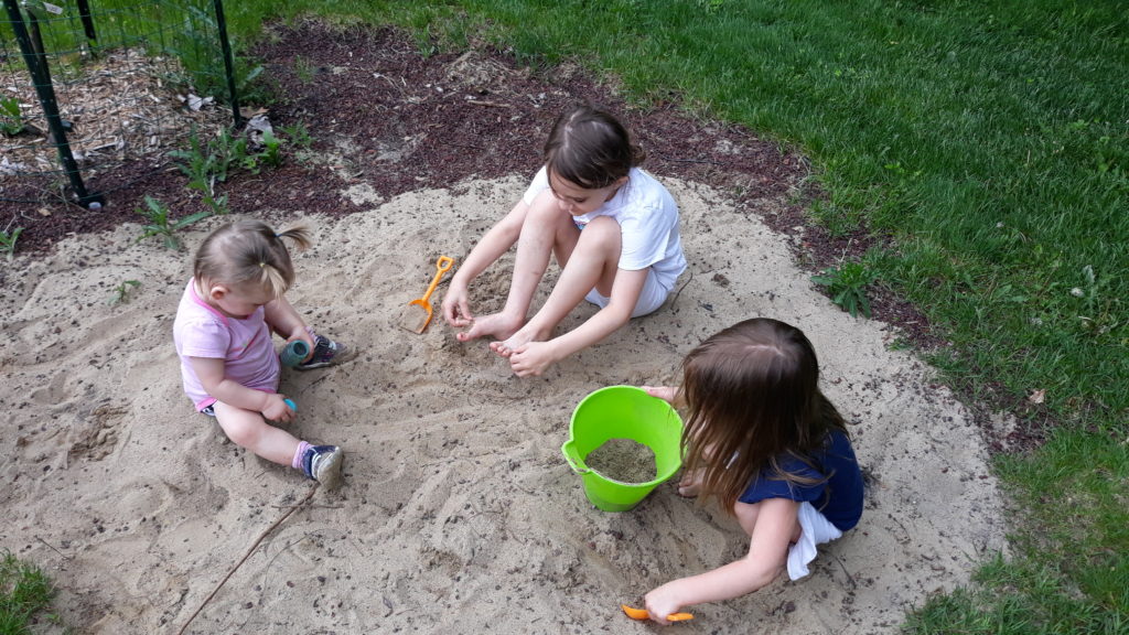 The girls also enjoyed some time in the “sandbox” (aka the sand left over from the old play structure. I think they are going to be pretty sad when it goes. I’m thinking of convince Matt to get one of those plastic turtle things with a cover so that we can keep it.