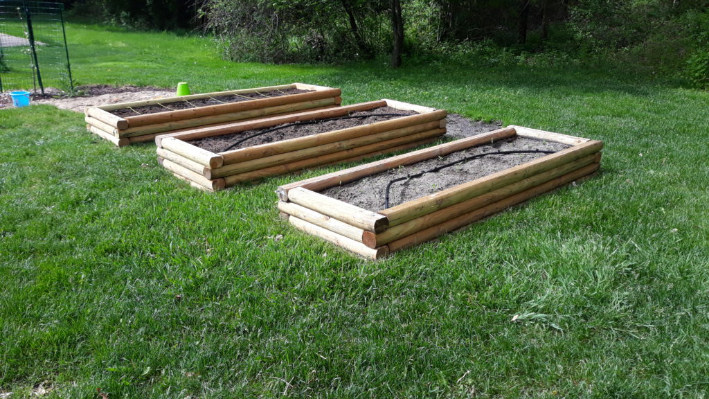 We have three garden beds. One will be for blueberries, one for raspberries, and one is a square foot garden. It will have tomatoes, cucumbers, jalapenos, artichokes, and a few other things that I don’t remember.