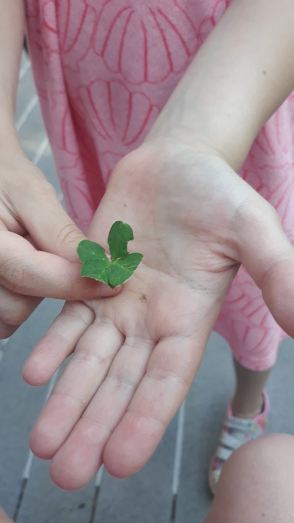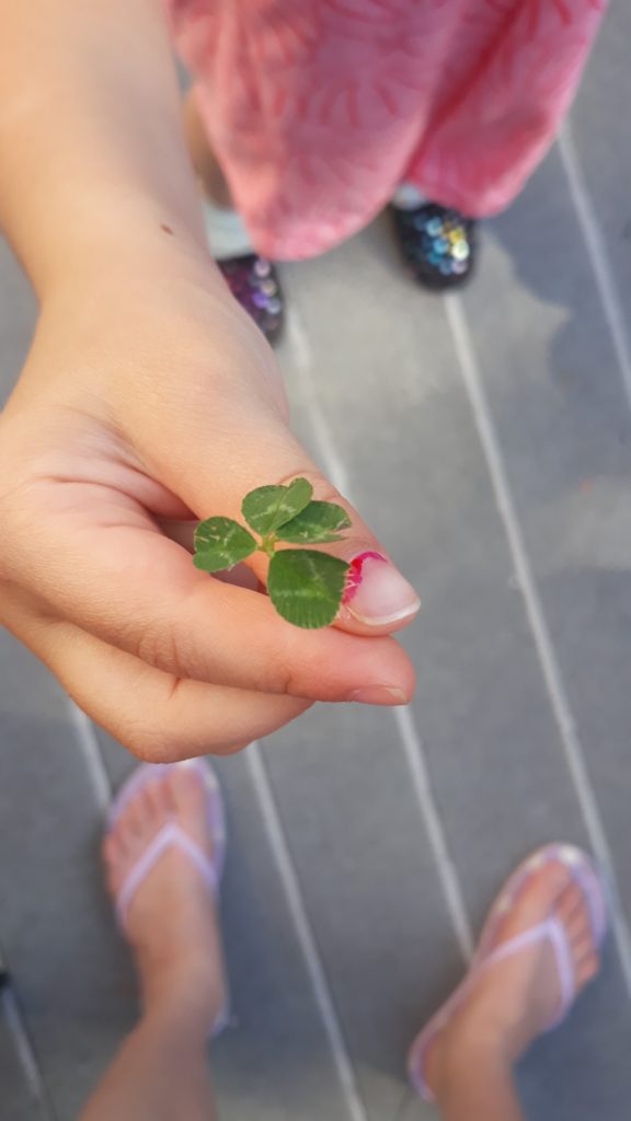 As the girls were waiting to eat dinner, they complained about being bored, so I told them to look for four leaf clovers, and guess what?? They both found one!!