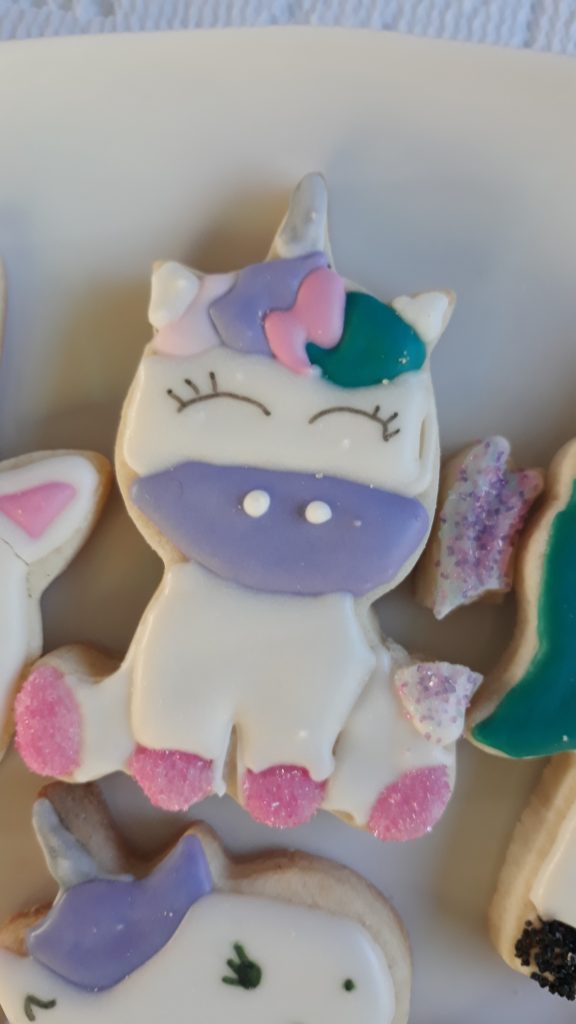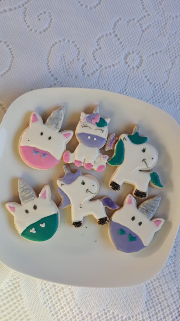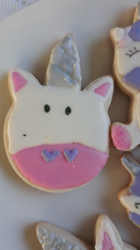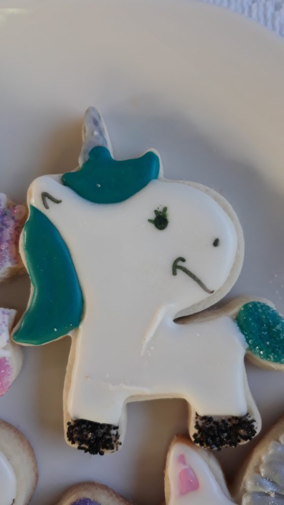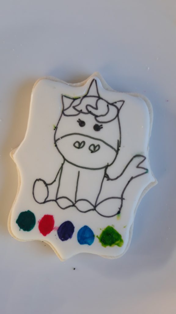 It was really easy to make these cookies. I simply used a big cookie cutter, then used white royal icing to cover it. After it dried I traced an unicorn cookie cutter using an edible pen, then used then pen to add some details. After that was done I “painted” on the dots using icing food dye which I mixed with a little bit of water. After letting them dry they are good to go. To paint the cookie, the kids just have to use a paintbrush (I gave them one which I only use for cookies) and have fun. 🙂