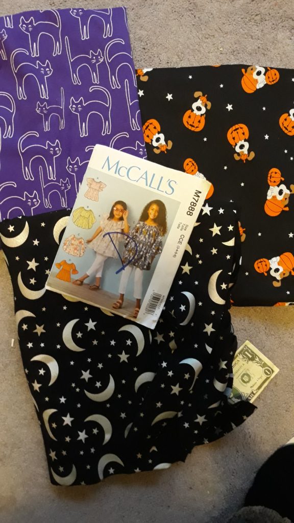 One day this week I headed to JoAnn Fabrics to pick up some cute fabric. By the cutting station they had free patterns for every two yards of fabric bought! I’m looking forward to sewing the girls some Halloween shirts.