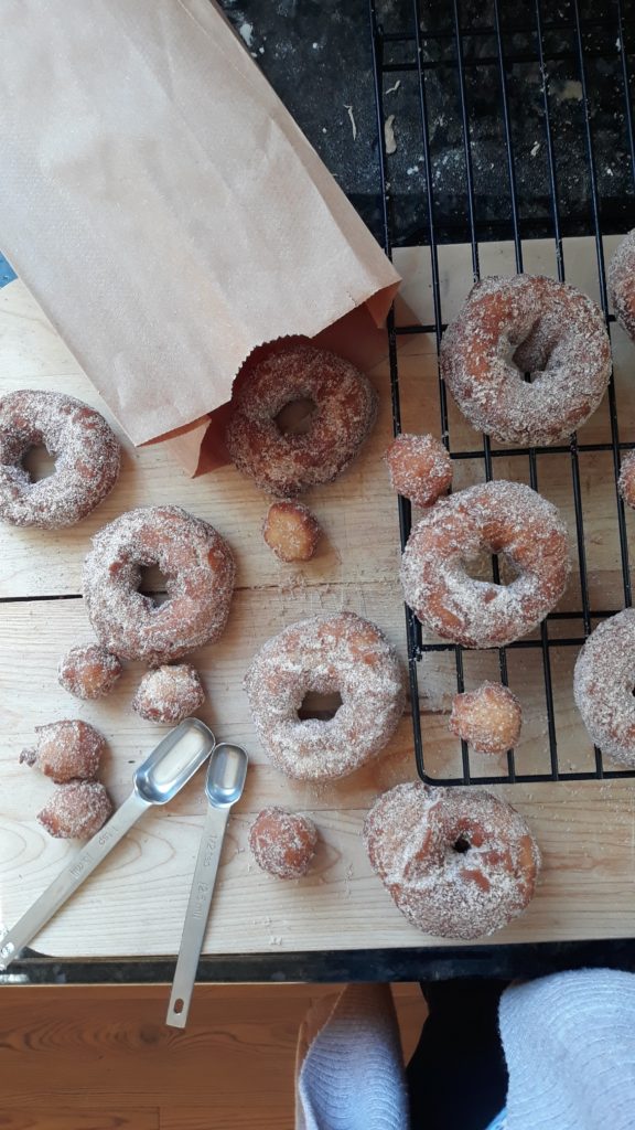 Last week the girls and I (well mainly me) made some homemade cider donuts. While they didn’t taste like the real deal, they were still pretty close.