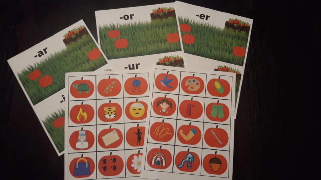 The first printable I want to share is sorting pumpkins. I haven’t done this with Annabelle yet (as I want to laminate the cards), but the activity is pretty self explanatory. Look at the pictures, and decide which r-controlled vowel it goes with. I am also going to have Annabelle write the words on a separate piece of paper. My hope is the more she writes them, the easier it will be for her to recognize what to use when doing her own writing.