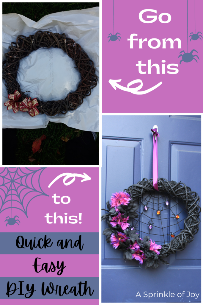 I also bought purple flowers, and some spider rings. I hot glued everything to the wreath and I was done! This inexpensive DIY Halloween wreath was so easy to make, I hope you found it inspiring!