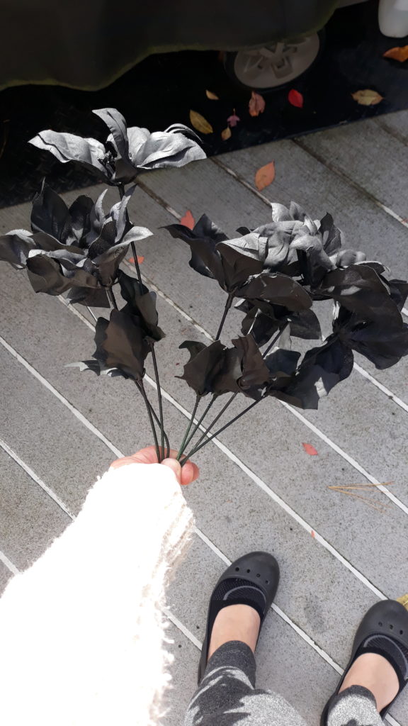 After, I added some decorations I got from the dollar store. I bought white flower, and spray painted them black. Please pay no attention to the footwear.