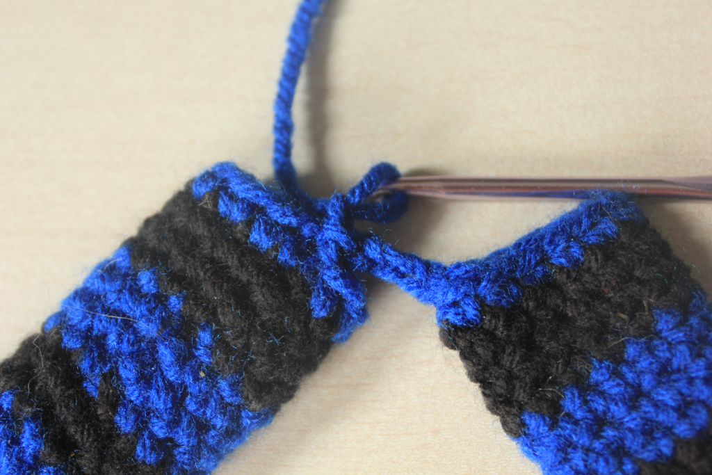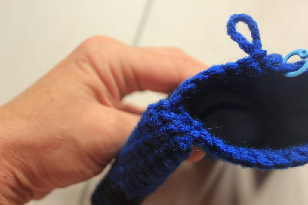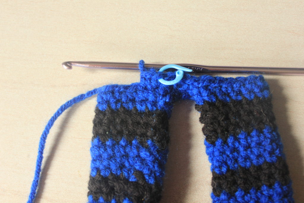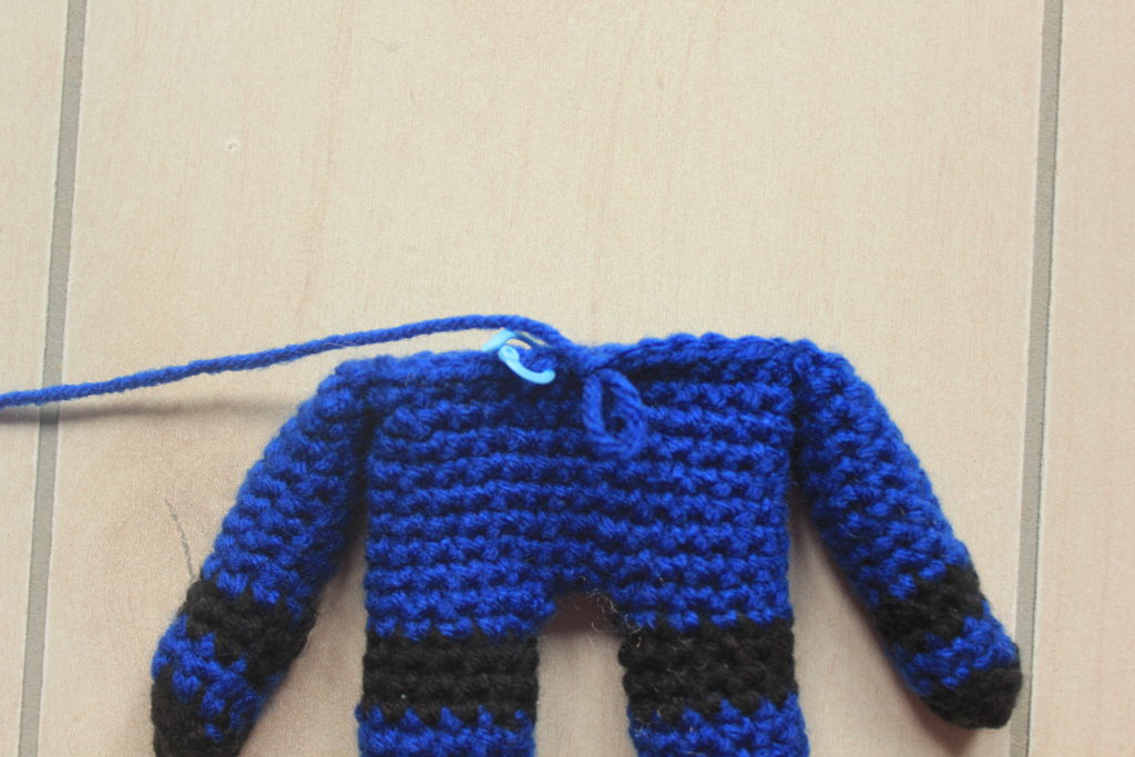 Place a marker on the place where you slipped stitched. sc around the leg (12 single crochets) then sc in each stitch of the chain (3 sc),