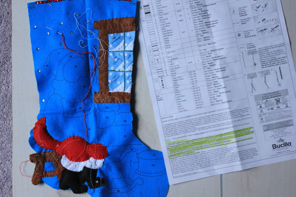 I am also continuing to work on Aubrie’s stocking I’ve gotten a tad bit farther now, and have one arm and one hand sewn on too. Since I can’t work on this when this when Aubire is up, I can only do it at night.