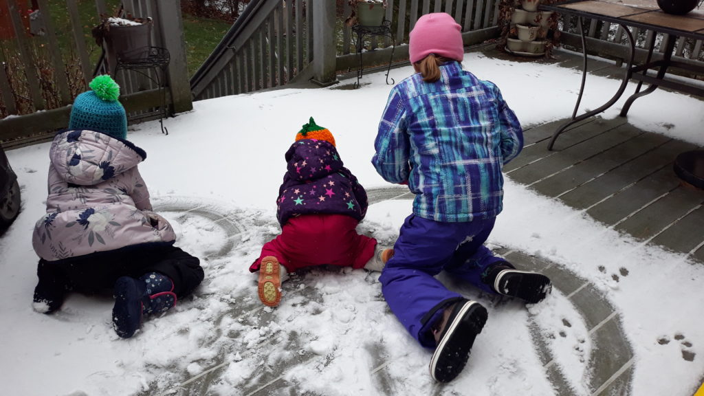 As an early child educator I know that outside play (and play in general) is so crucial to the development of children. Kids learn so much through open ended play. They work on problem solving skills, get physical activity, and just gives them the chance to learn about the world. For example, my girls have learned going down the slide in your snow pants makes you go super fast, and is super fun. They’ve learned that light fluffy snow is not as good at making snowmen, and that they need it to be warmer to make packing snow.